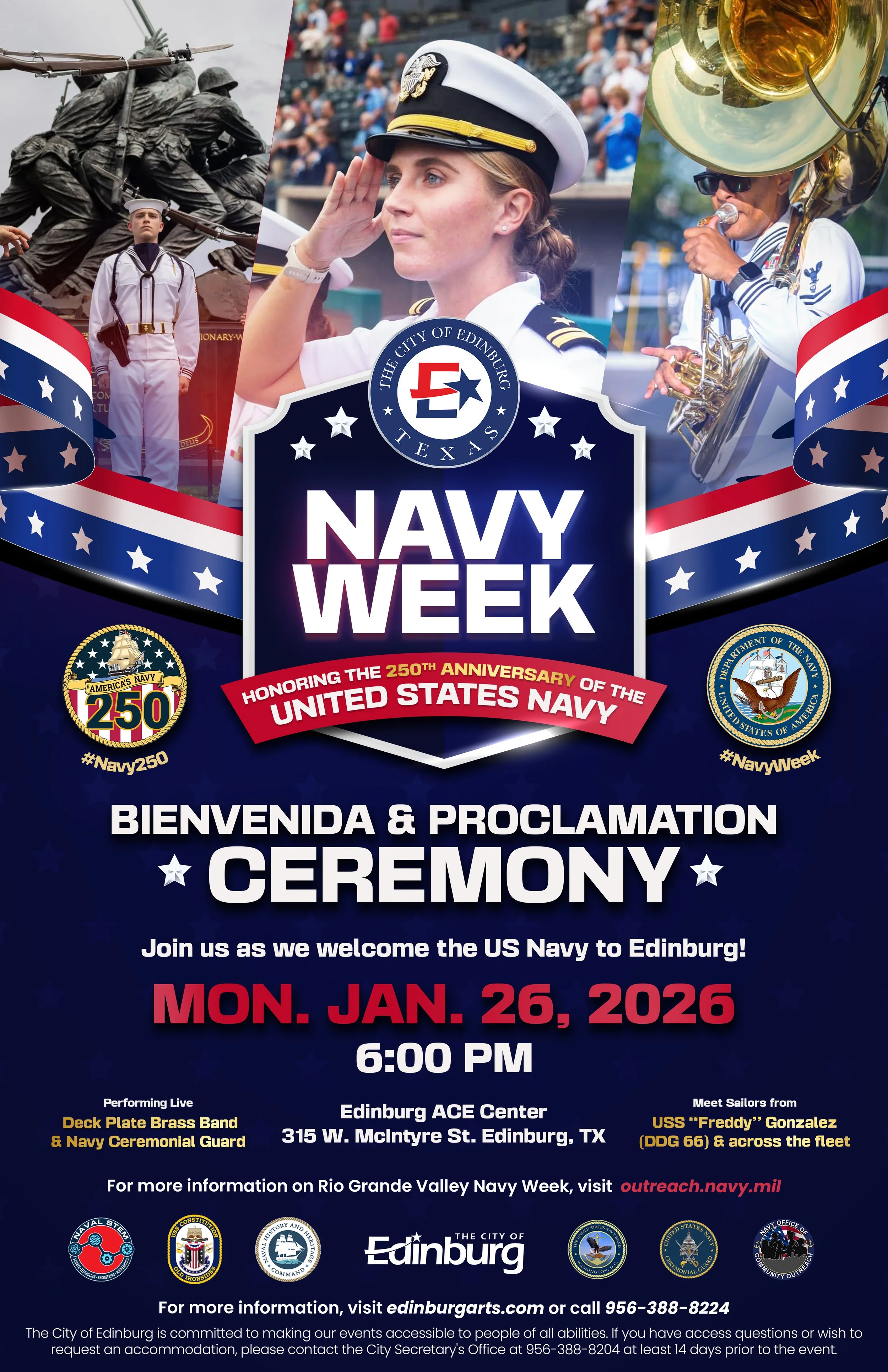 As part of the inaugural Rio Grande Valley Navy Week, the City of Edinburg will host a Navy Week Proclamation & Bienvenida on Monday, January 26 at 6:00 p.m. at the Edinburg ACE Center. This special evening will welcome United States Navy Sailors to the community and recognize Edinburg’s role in this national outreach initiative. Navy Week connects communities without a major naval presence to the Navy’s mission through public engagement, cultural exchange, and education. The event highlights Edinburg’s strong ties to military service and honors the men and women who serve our country.