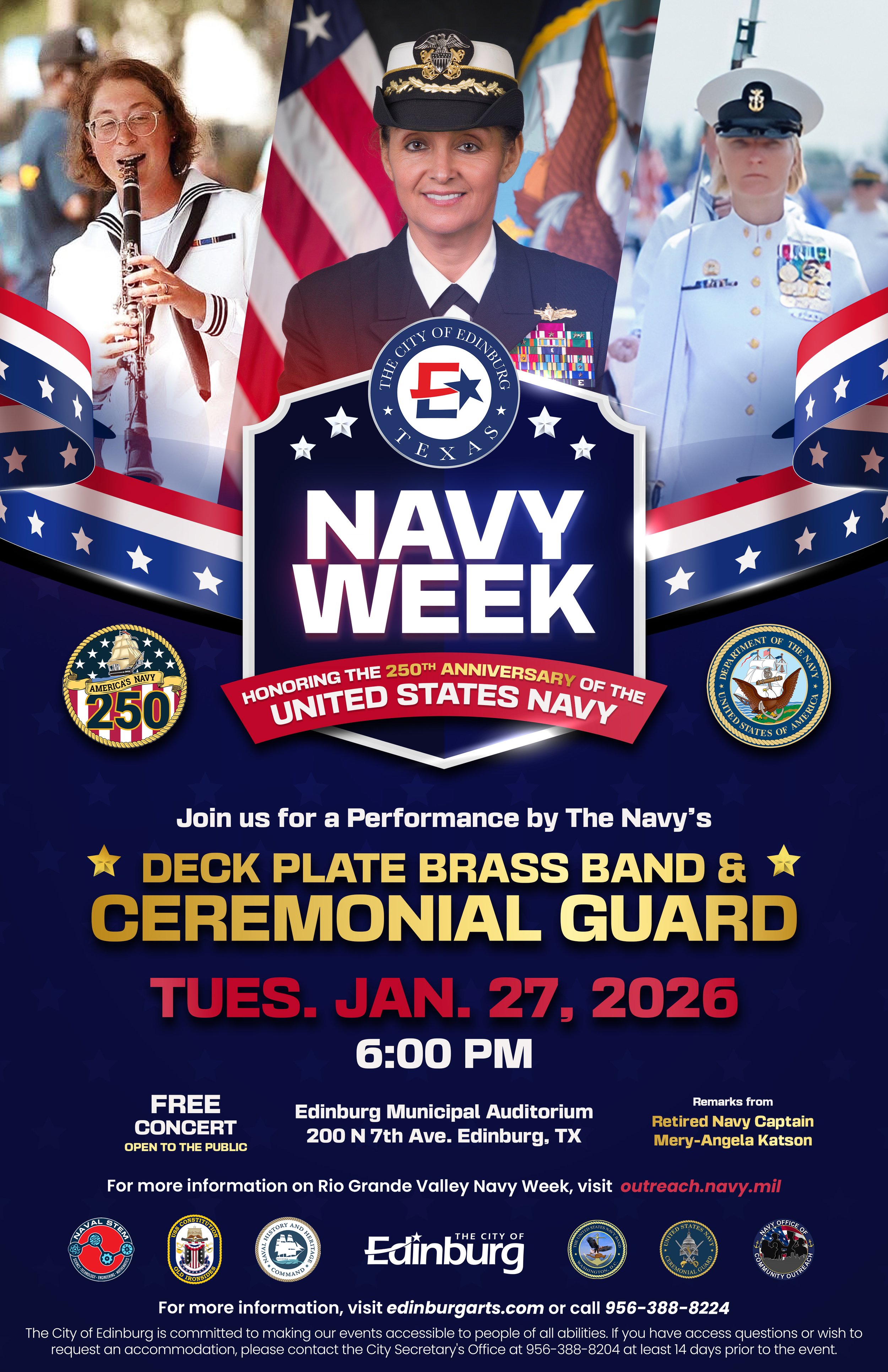 Please join us for a special performance by the U.S. Navy’s Deck Plate Brass Band and Ceremonial Guard on Tuesday, January 27 at 6:00 p.m. at the Edinburg Municipal Auditorium (EMA). This family-friendly event features high-energy music and precision ceremonial honors that showcase Navy tradition and service. As Navy Week launches the Navy’s 2026 national outreach schedule and aligns with the nationwide “Road to 250” celebration leading up to America’s 250th anniversary, Edinburg is proud to serve as a host city connecting the Rio Grande Valley to the Navy’s mission of service, freedom, and national defense.