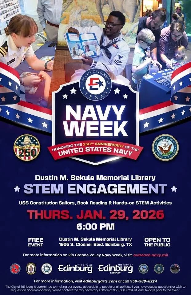 The City of Edinburg will host a STEM Engagement and Book Reading on Thursday, January 29 at 6:00 p.m. at the Edinburg Memorial Public Library. This family-friendly event will feature interactive STEM activities led by U.S. Navy Sailors, designed to inspire curiosity, learning, and interest in science, technology, engineering, and math among students of all ages. The program offers the community a unique opportunity to engage with Navy professionals while celebrating education, innovation, and service during Navy Week.